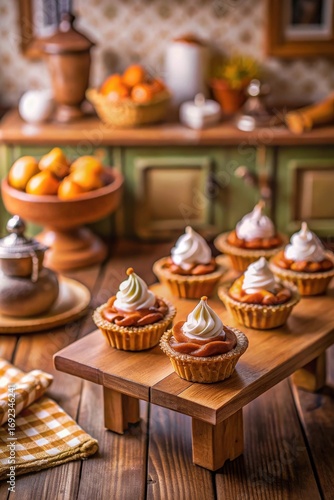 Photo of a delightful assortment of mini tarts topped with swirls of cream, arranged on a wooden board, set against a charming kitchen backdrop with fruits and vintage decor