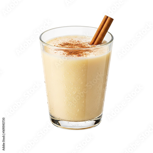Photo of a glass of eggnog topped with cinnamon and a cinnamon stick, isolated on transparent background