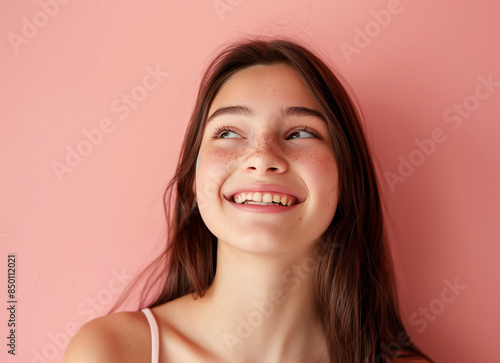 photo of a happy teenage girl with straight brown hair looking up an smiling on a pink pastel background. Happiness and youth concept