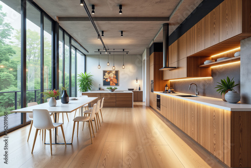 apartment, interior, room, kitchen, table, home, furniture, design, chair, house, dining, wood, floor, contemporary, luxury, window, chair, architecture, living, decor, nobody, style, sofa, loft, indoor, dining room, eatery, wooden