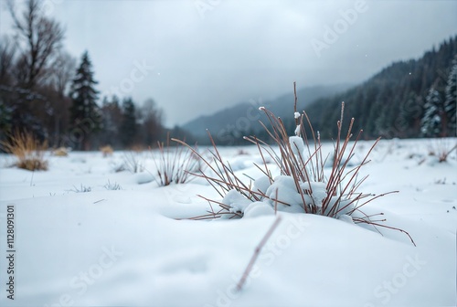 Photo of a snowy panoramic landscape at sunset, frozen trees