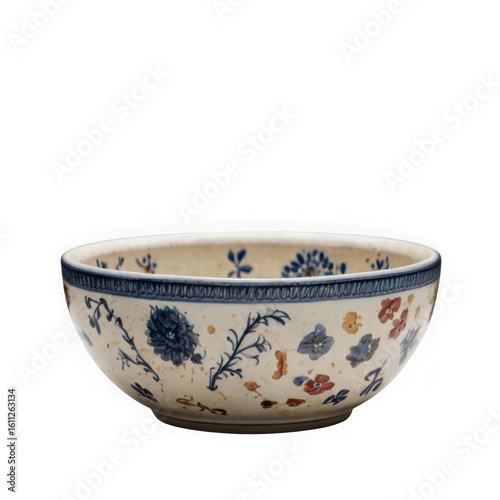 Photo of a vintage ceramic bowl with a blue and red floral pattern, isolated on a transparent background