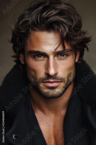 young, man, male, mediterranean, tanned, skin, chiseled, tousled, dark, brown, hair, intense, gaze, deep, eye, neatly, trimmed, beard, furrowed, brow, brooding, confident, expression, black, heavy, jacket, fur, collar, open, toned, muscular, chest, rugged, appearance, muted, neutral, background, dramatic, lighting, highlight, shadow, masculinity, mystery, fashion, photo, modern, portrait, cinematic