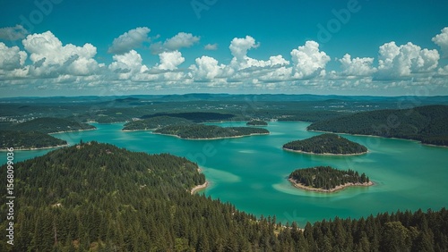 aerial, view, lake, island, water, turquoise, green, forest, tree, nature, landscape, scenic, outdoors, travel, summer, blue, sky, cloud, huge, remote