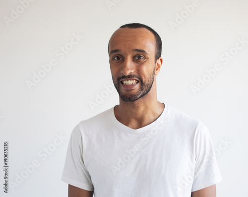 Photo of afro man wear white t-shirt isolated on grey background