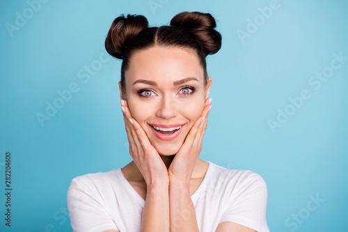 Photo of amazing lady with cute hairstyle holding arms on cheekbones wear white casual t-shirt isolated blue background