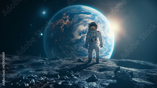 Photo of astronaut in white spacesuit, helmet visor reflecting stars. Standing on the moon with the Earth visible in the starry sky. Astronaut centered, Earth in background. Bright sunlight with soft