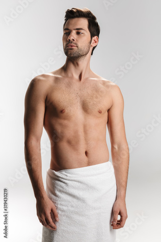 portrait, man, guy, male, photogenic, coiffure, 1, indoor, studio, basic, inside, young, masculine, bristle, unshaved, confident, satisfied, looking, alone, posing, copy space, closeup, isolated, beautiful, wall, background, half-naked, shirtless, calm, model, face, caucasian, brutal, fresh, body, white, sexual, attractive, good-looking, towel, shower, spa, clean