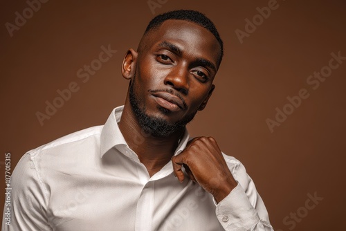 Photo of attractive Black businessman in white shirt on brown backdrop