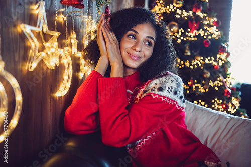 Photo of attractive creative girl sit comfy couch fantasize contemplate christmas decor lights apartment indoors
