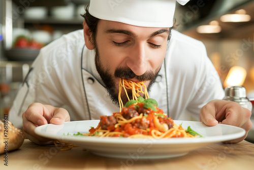 Photo of attractive male cook with love to food italian spaghetti