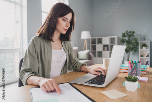 Photo of charming intelligent lady write economy finance statistic check weekly report use netbook macbook office room home indoor
