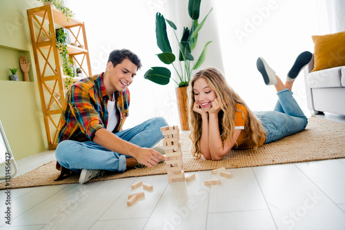 Photo of charming positive two people couple lying floor playing game pile stack wooden blocks indoors room