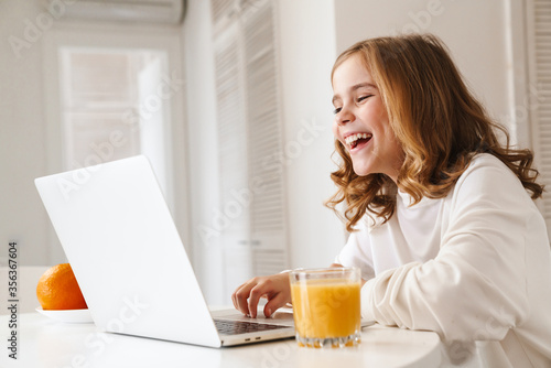 girl, fun, happy, cheerful, children, children, lovely, indoor, caucasian, female, 1, schoolgirl, adorable, beautiful, woman, blond, pleased, young, charming, curly, alone, joyful, pretty, casual attire, breakfast, fresh, sitting, kitchen, modern, cosy, laughing, smiling, talking, drinking, juice, laptop, computer, notebook, using, homework, typing, excited, delighted