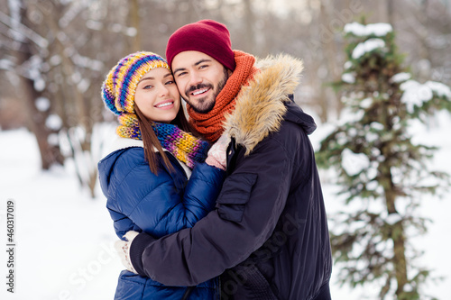 Photo of cheerful young man charming lady hugging toothy smile look camera spend weekend forest outdoors