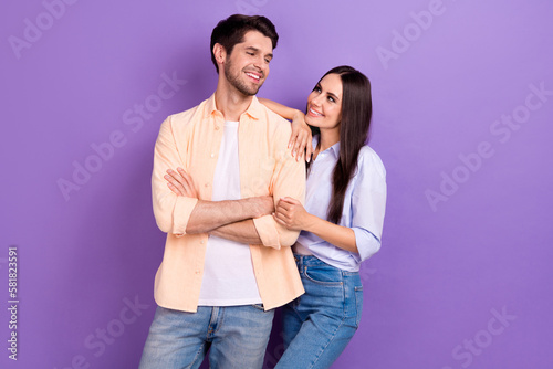 Photo of confident couple together looking each other folded hands satisfied candid people casual trendy clothes isolated on violet color background