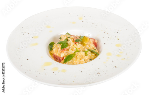photo of delicious risotto dish with herbs and tomato on white b
