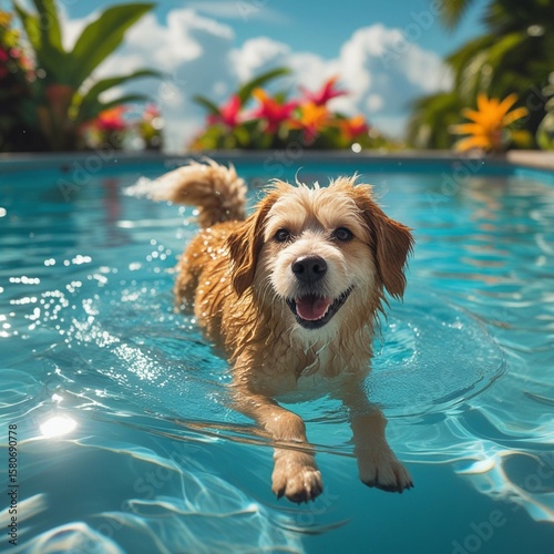 canino, home, happy, water, animal, exercise, puppy, fun, dog, pool, summer, play, baby, holiday, funny, labrador, pet, photo, swimming, active, wet, vacation, weekend, dive, swimming pool, activity, have fun, popular, playful, ai, generate