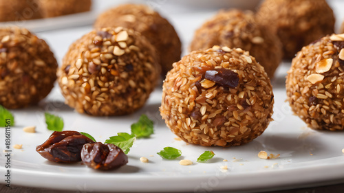 Photo of energy date balls isolated. Generative AI
