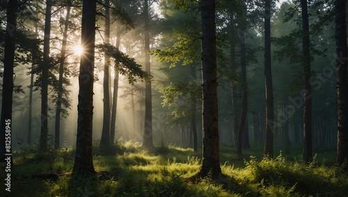 photo of forest scenery with many trees in the morning made by AI generative