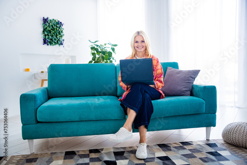 Photo of freelancer pensioner lady sit comfy divan using netbook for chatting indoors