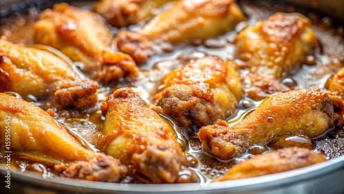 Photo of golden brown chicken wings sizzling in hot oil, glistening with a savory sauce and ready to be served as a delectable appetizer