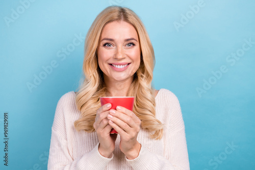 Photo of gorgeous lovely adorable woman wear trendy white clothes enjoy tasty tea isolated on blue color background