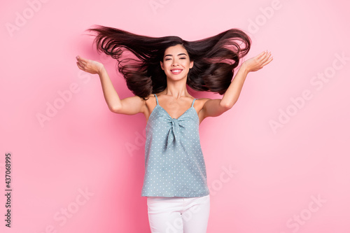 Photo of happy nice attractive young woman fly hair blow wind good mood smile isolated on pink color background
