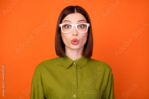 Photo of impressed brunette hairdo millennial lady wear eyewear khaki shirt isolated on orange color background
