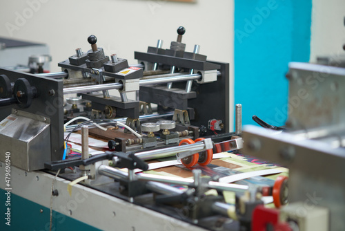 Photo of industrial print offset machine printing and processing labels for packaging products