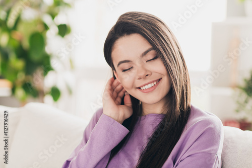 Photo of lovely young teen girl charming tuck hair behind ear dressed violet garment spacious house bright indoors room
