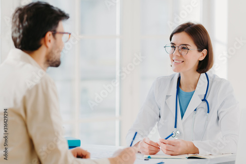 Photo of male patient writes all details makes notes during consultancy with doctor sit in spacious office. Physician tells treatment issues and explains diagnosis to hospital visitor. Medical concept