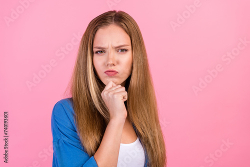 Photo of moody thoughtful lady dressed blue shirt arm chin empty space isolated pink color background