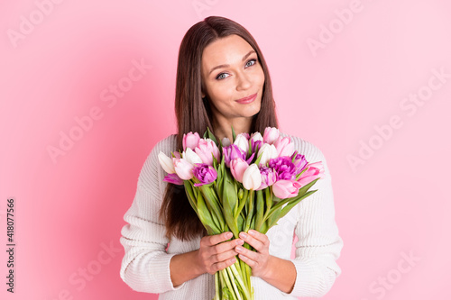 Photo of nice sweet charming young woman hold flower bouquet present holiday isolated on pink color background