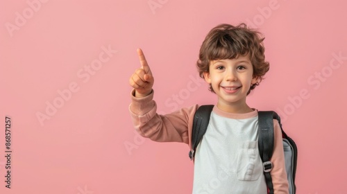 Photo of positive boy kid point finger copyspace hold rucksack isolated pastel color background
