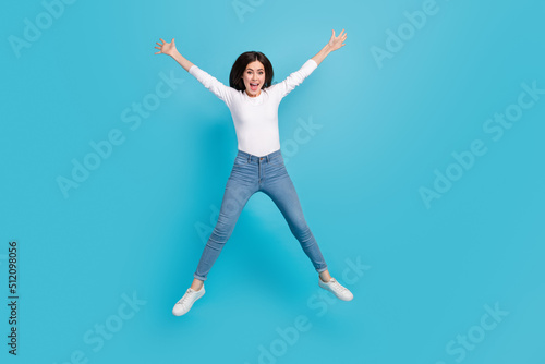 Photo of pretty adorable woman wear white shirt jumping high like star isolated blue color background