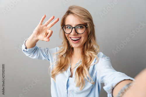 Photo of pretty blond businesswoman wearing eyeglasses smiling and showing ok sign while taking selfie