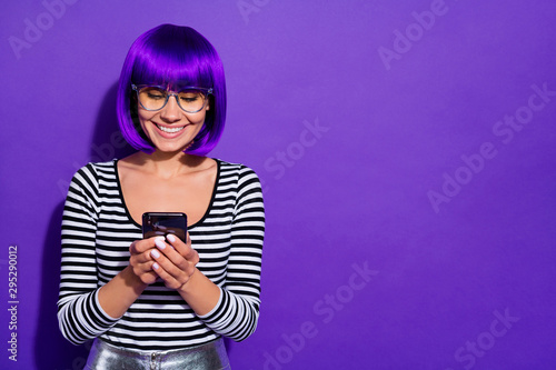 Photo of pretty lady holding hands new telephone reading friends letter wear specs striped pullover isolated purple background
