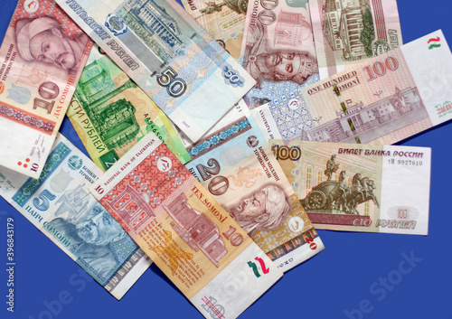 Photo of rubles bank notes from Russia, pounds bank notes, euro banknotes, dollars on blue background. Money consept
