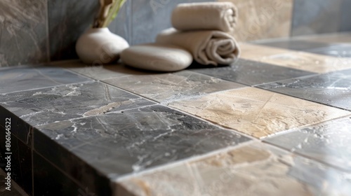 Photo of square shaped natural stone tiles with an F joint, in a grey and beige color palette, with natural light, product photography, close up shot, high resolution.