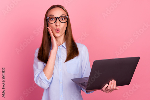 Photo of surprised girl working on laptop made mistake 404 error isolated pink color background