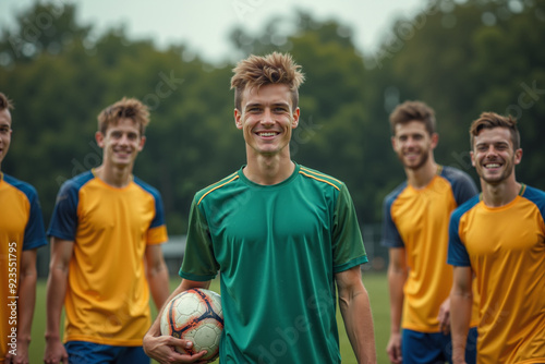 photo of teenage youth soccer player portrait group shot at soccer field, generative AI