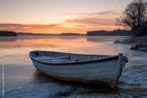 boat, winter, lake, shore, wooden, icy, glacé, water, snow, tree, landscape, nature, still, calm, peaceful, tranquil, serene, beautiful, rustic, classic, lonely, isolated, desolate, cold, crisp, fresh, white, blue, shadow, sunlight
