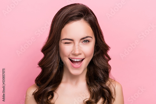 Photo of young adorable girl wink eye pure silky skin collagen lifting isolated over pink color background