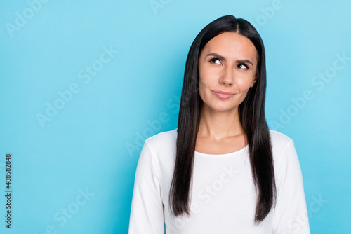 Photo of young adorable woman wonder dreamy look empty space thoughtful isolated over blue color background