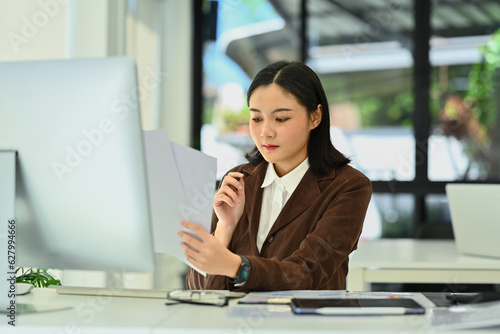 Photo of young businesswoman in stylish suit working with financial reports at desk