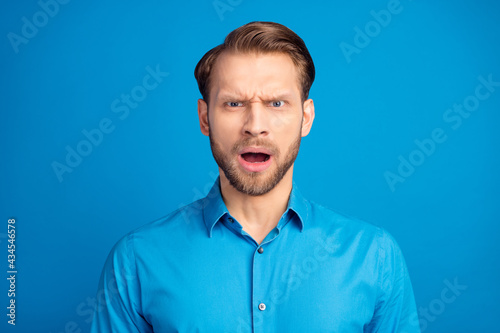 Photo of young man unhappy sad upset negative shocked angry problem isolated over blue color background