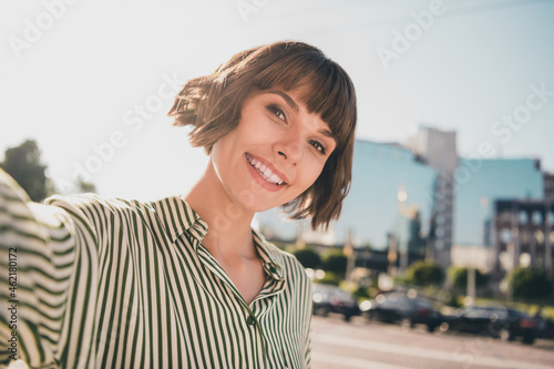 Photo portrait female student in casual clothes smiling walking on city street travelling on holidays talking selfie