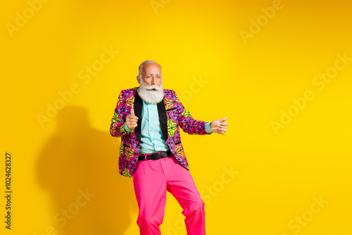Photo portrait of attractive retired man have fun dance dressed stylish colorful pink fancy clothes isolated on yellow color background