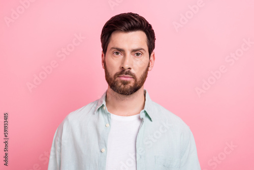 Photo portrait of attractive young man serious face indifferent calm dressed stylish blue clothes isolated on pink color background